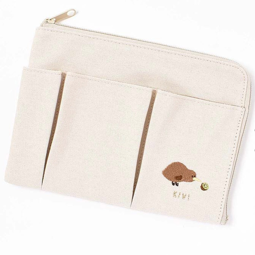 A flat pouch with plenty of pockets featuring a pygmy hippopotamus with a cheerful expression.
