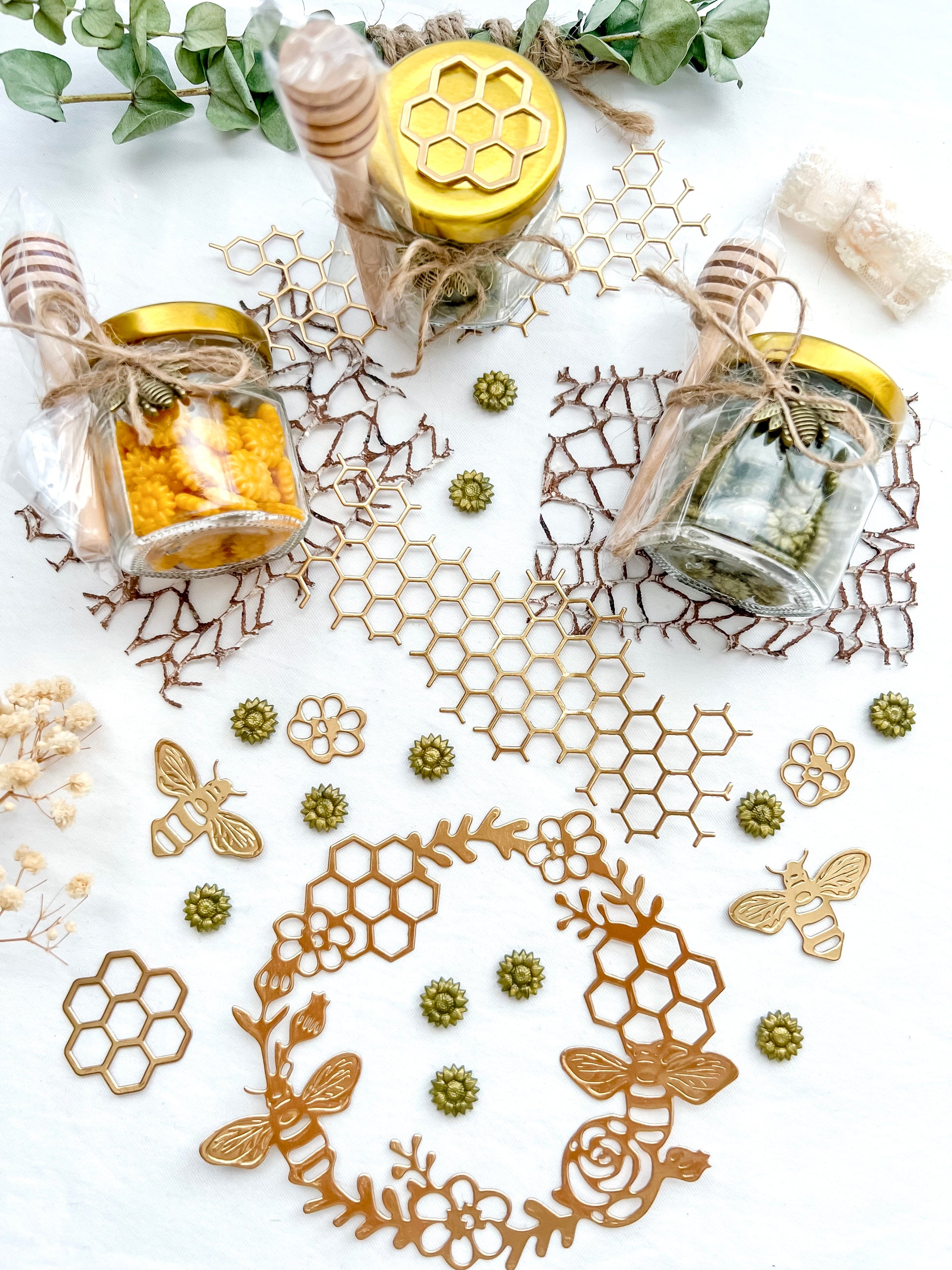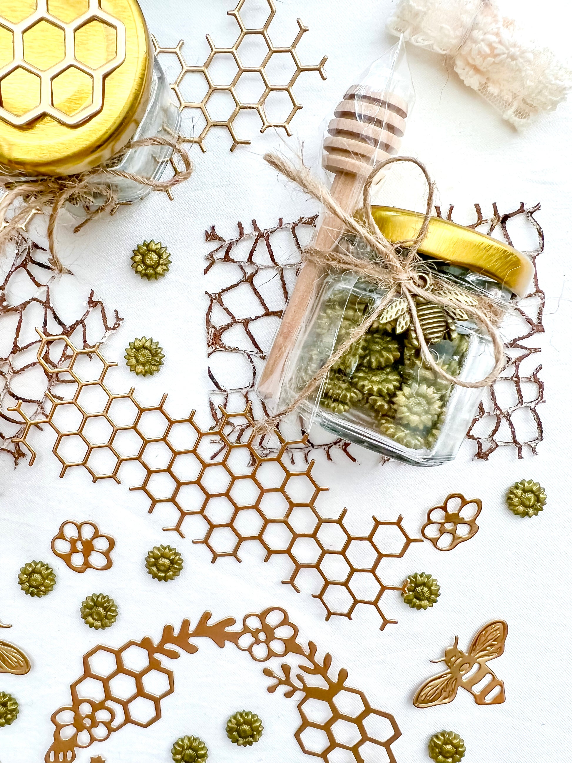 Sunflower Wax Beads Glass Hexagon container with wooden dipper Metallic Gold Die Cuts