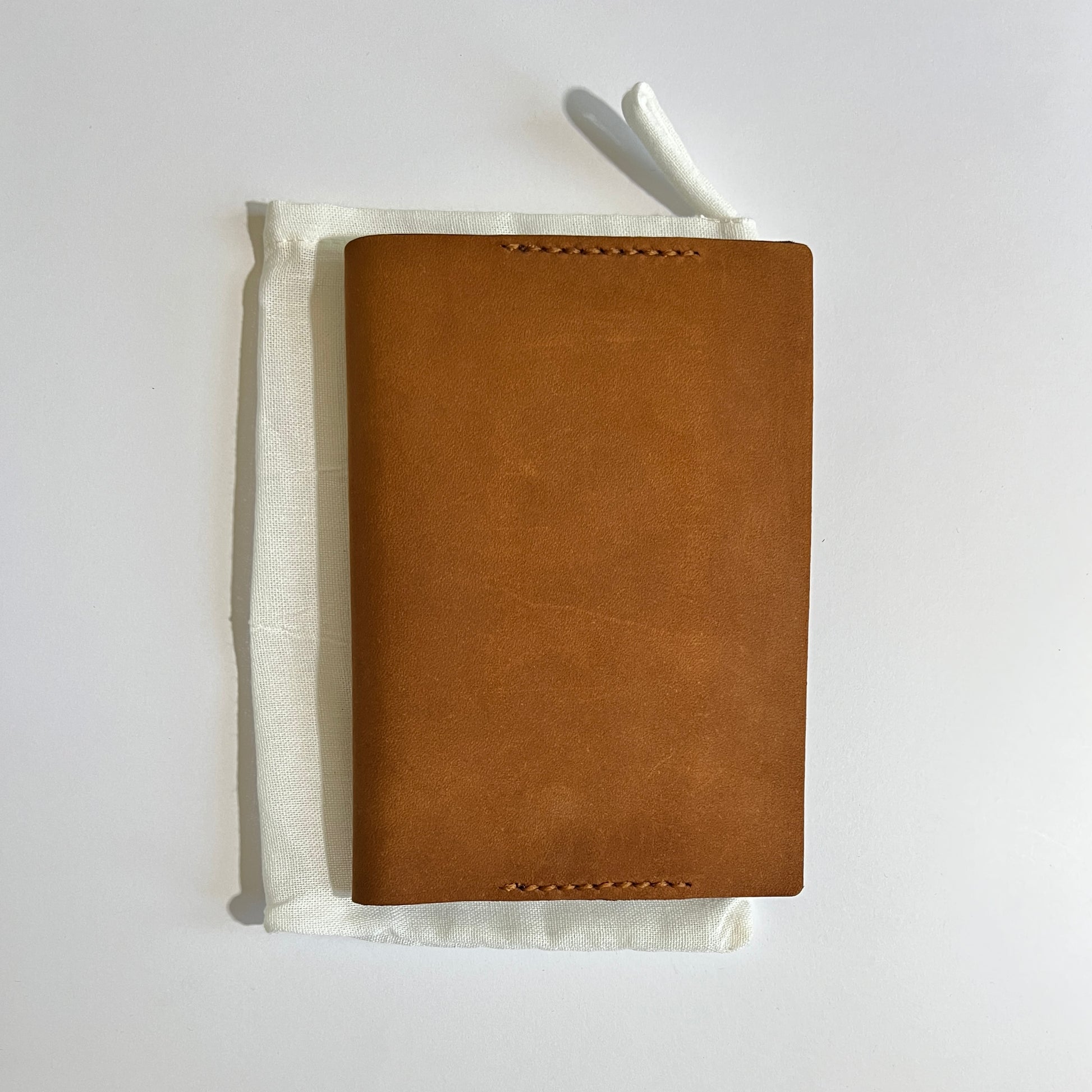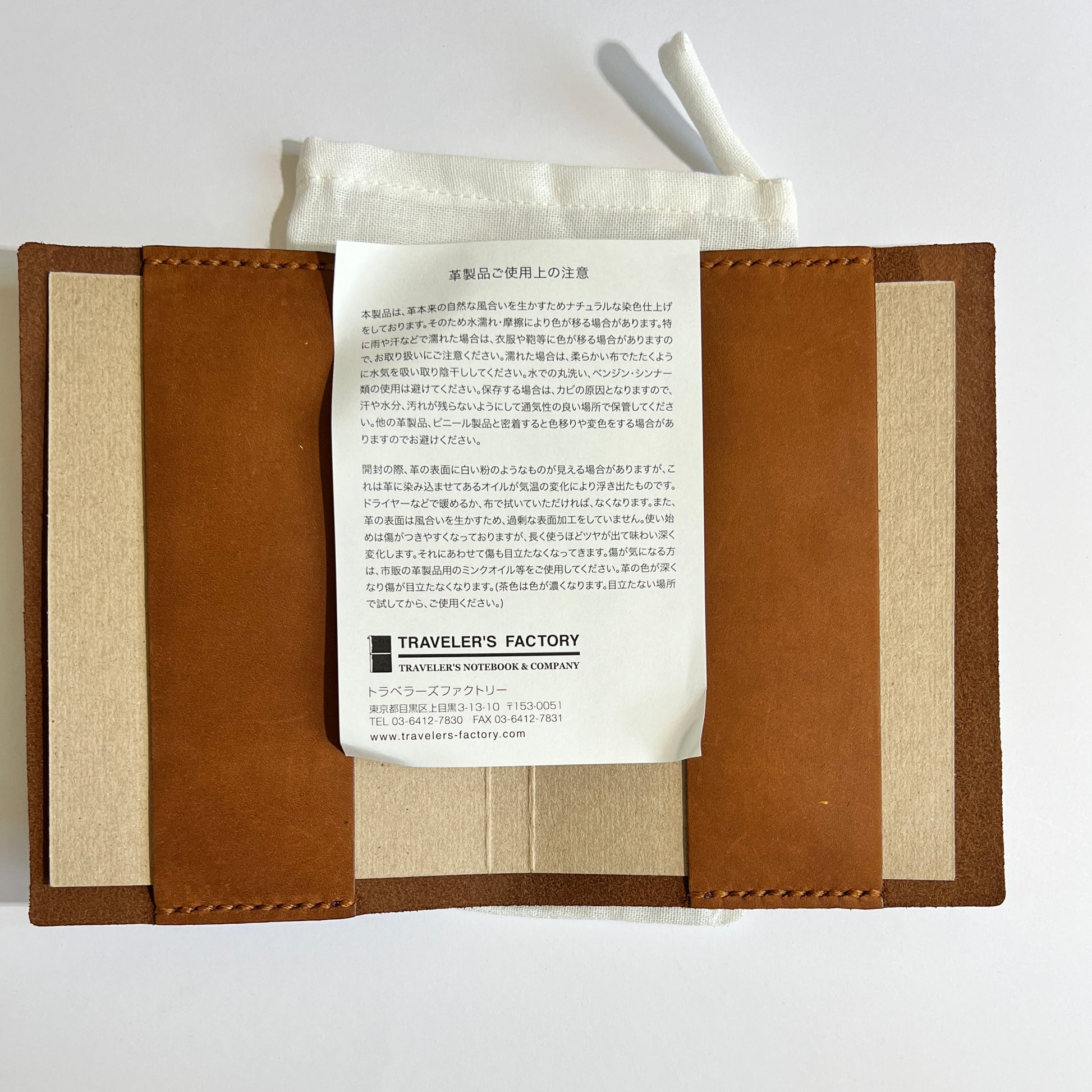 Designed to be simple and roughly usable like a Traveler's Notebook. It is used by passing the cover through the inner band-shaped sleeve that is carefully sewn one by one by hand stitching. The more you use it, the more delicious the leather will change.